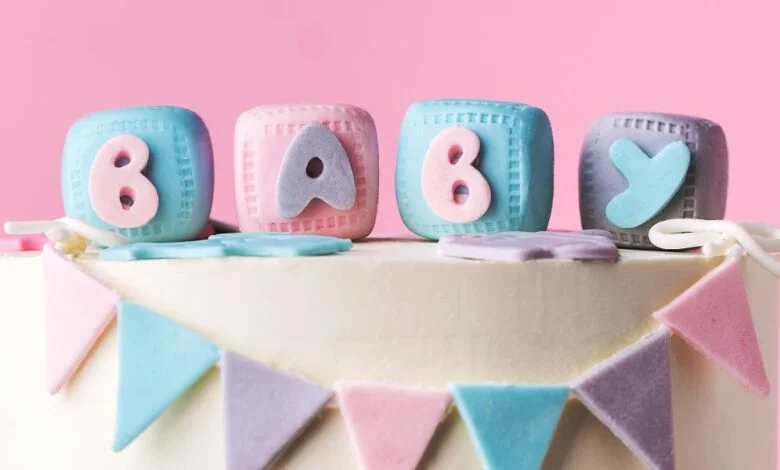 Ada balon biru lembut yang diikat ke kursi putih, sandwich kecil yang ditumpuk rapi dalam segitiga, dan kue bertingkat tiga yang dihiasi sepatu bayi dari gula dan bintang perak.