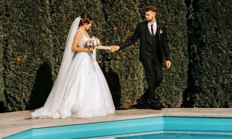 Pasangan pengantin berpose di depan kolam renang | Sumber: Midjourney