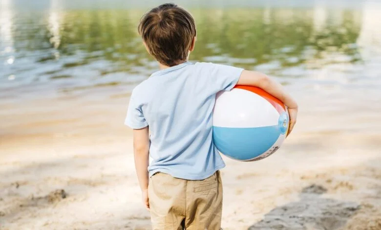Seorang anak laki-laki berdiri di pantai dan memegang bola | Sumber: Midjourney